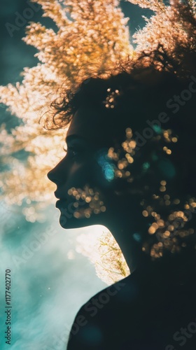 Woman with glowing silhouette surrounded by ethereal light and soft natural elements during a tranquil moment
