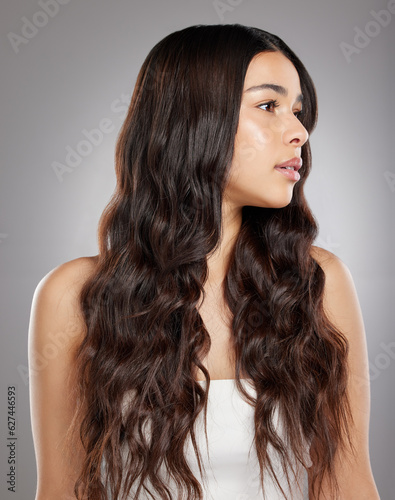 Woman with hair, beauty with balayage and curly hairstyle with haircare and keratin treatment on studio background. Female person with shine and texture, growth and grooming with glamour and glossy