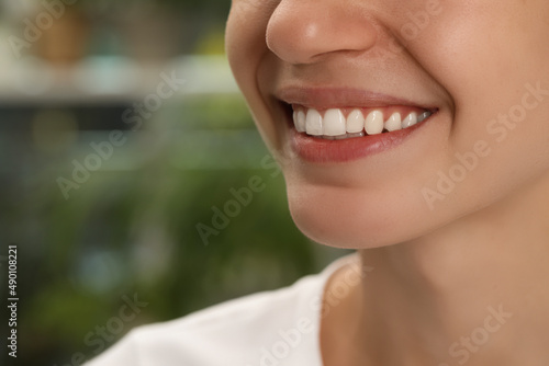 Woman with healthy teeth on blurred background, closeup. Space for text