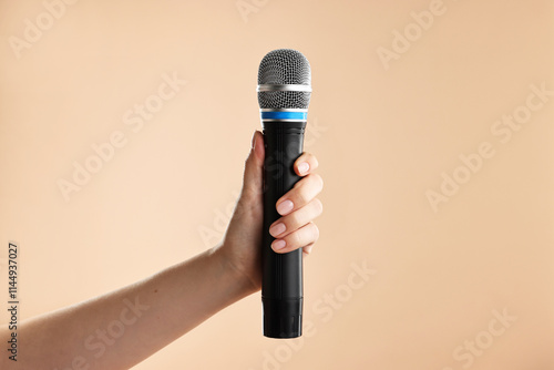 Woman with microphone on beige background, closeup