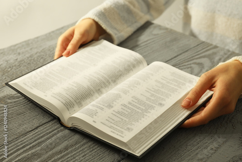 Woman with open Holy Bible in English language at wooden table, closeup