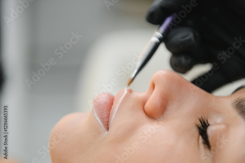 Woman With Permanent Lips Makeup at Beauty Salon During Permanent Makeup Tattoo While Drawing Contour with White Lip Pencil