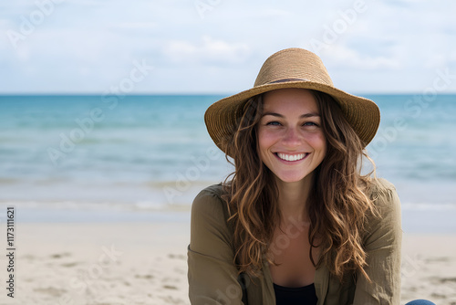 Woman with summer sunhat at the beach, portrait of a girl travel and sunbath on the water