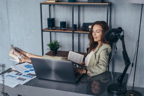 Woman working in an office with her feet up on her table