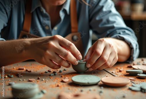 Woman working on handmade pottery at a craft table with various clay pieces