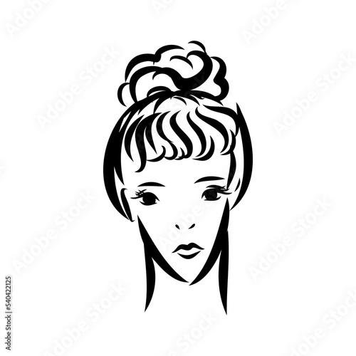 Womans face. Sketch. The head of the girl in full face. Vector illustration. Haircut for medium hair-cascade. Plump lips. Lady with heterochromia. One eye is blue, the other brown. Female portrait.