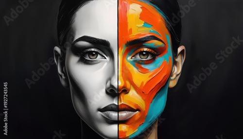 Woman's Face Split With Black And White And Colorful Paint