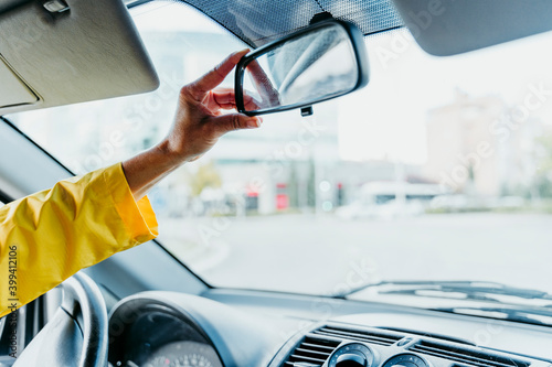 Woman's hand adjusting car mirror