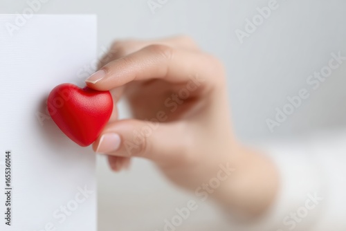 Woman's hand holding a small red heart next to a blank white card, representing love, affection, Valentine's Day, or healthcare