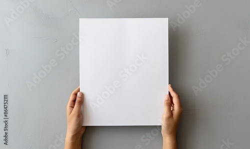 Woman's Hands Holding Blank White Paper Against Grey Background