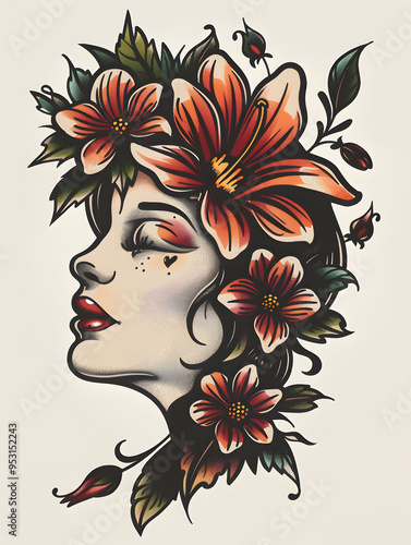 Womans Head with Flowers very simple traditional tattoo flash styles illustration