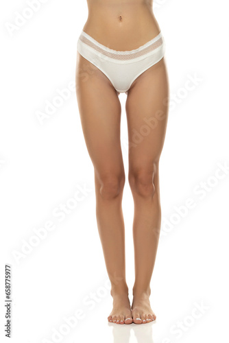 woman's legs are elegantly posed, showcasing white panties from the front on white studio background.
