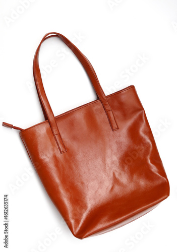 Woman's light brown leather tote bag isolated on white background. Modern bag