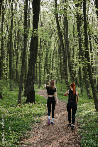 Women exercising on a forest trail in spring