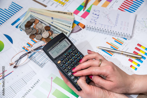 women hold calculator above business chart with money