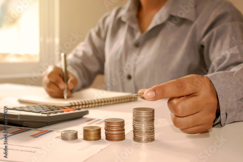 Women holding coins and stacked coin charts, including wooden work notebooks, ideas for saving money and financial growth.