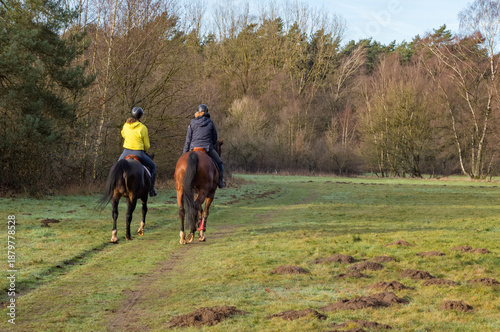 Women riding horses on a trail through field and forest
