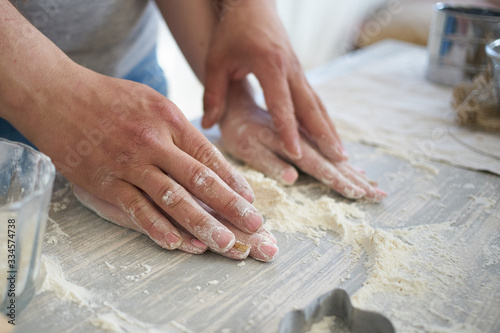 women's and men's hands mix wheat flour. baker's hand closeup.couple together Cooking pizza, bread
