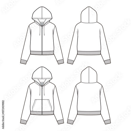 Women's Cropped Zip-Up Hoodie and Pullover Hoodie Front and Back View Vector Template