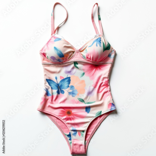 Women's one-piece swimsuit with floral pattern isolated on white background, flat lay