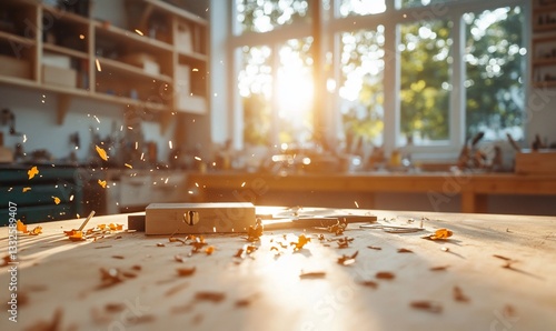 Wood shavings on workbench in sunlit workshop.