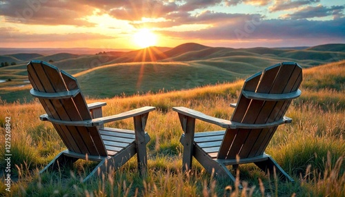 Wooden Adirondack Chairs Facing Each Other at Sunset