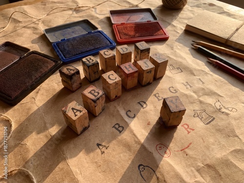 Wooden alphabet stamps and ink pads arranged on textured paper