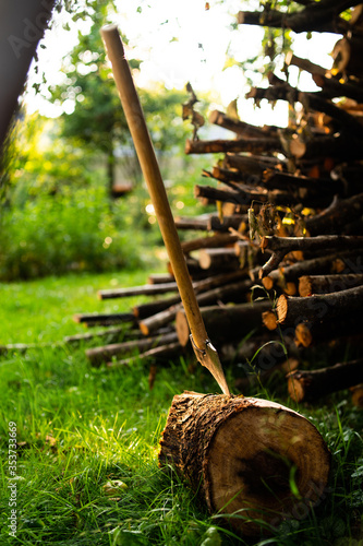 Wooden background. Firewood stack for the background. A lot of cutted logs. Stack of sawn logs. Natural wooden decor background. Pile of chopped fire wood prepared for winter. photo with axe.