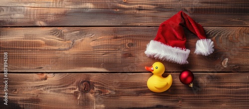 Wooden background with Santa s hat and a Christmas duck providing ample copy space image