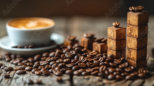 Wooden blocks forming a bar chart, with coffee beans and a cup of cappuccino, on a minimalist white background