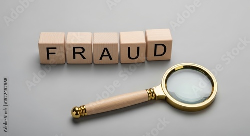 Wooden blocks spelling fraud next to magnifying glass on grey background
