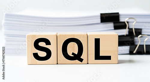 Wooden blocks spelling sql with documents and binder clips in the background for database management and query language concepts