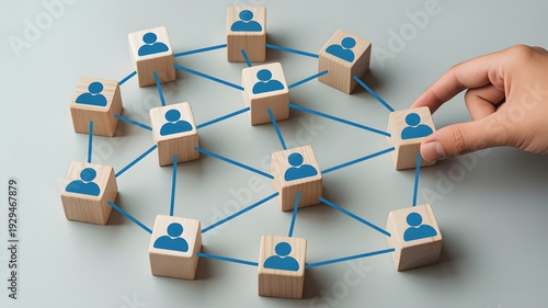Wooden blocks with blue connected by lines forming a social network diagram