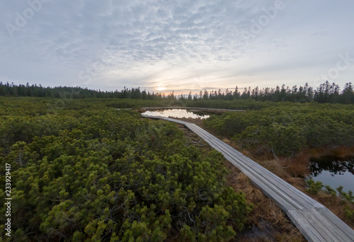 Wooden boardwalk crossing marshes surrounded with bushes.