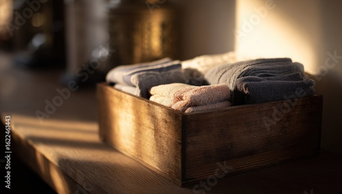 Wooden box filled with folded clothes, bathed in warm sunlight