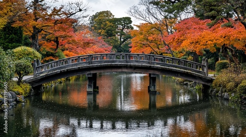 Wooden bridge over calm water reflecting autumn foliage in a serene garden.