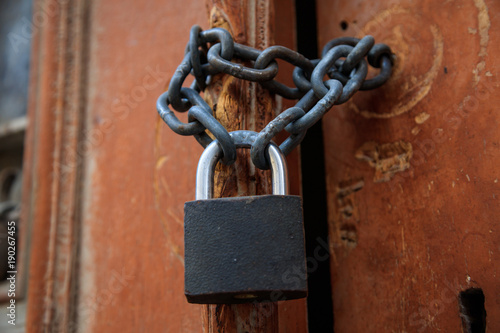 Wooden brown peeled door for background. Padlock with chain forbidden the entrance. Close up, detail