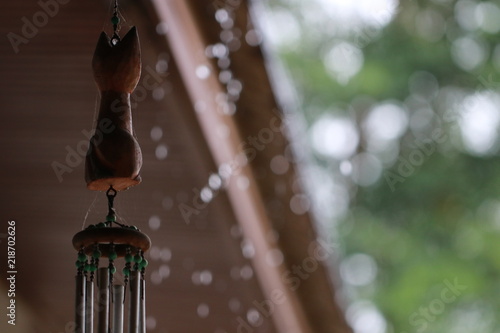 Wooden cat mobile hanging and white bokeh on brown and green background