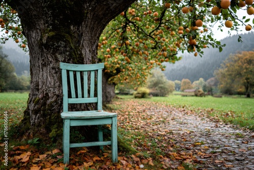 Wooden chair resting under ancient apple tree in autumn