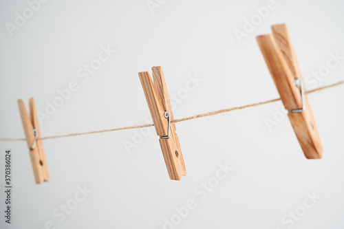 Wooden clothespins on rope on white background.