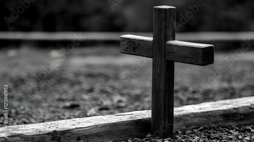 Wooden cross grave marker, somber cemetery, blurred background, remembrance
