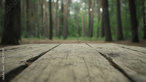 Wooden Deck Overlooking a Beautiful Tranquil Forest in Soft Focus Background