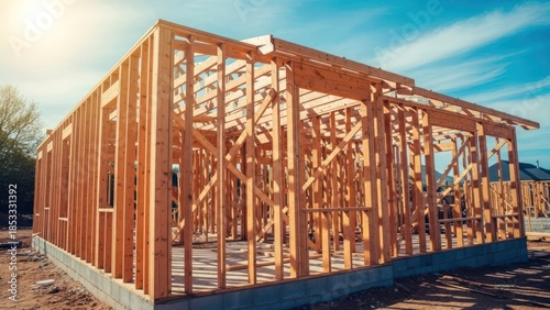 Wooden framework of a house under construction, set against a bright, sunny sky