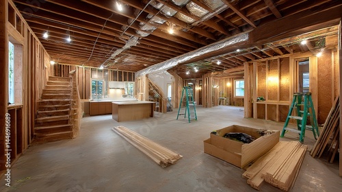Wooden framing evolves into sleek kitchen cabinetry, blending raw structure with modern design in a diagonal composition.