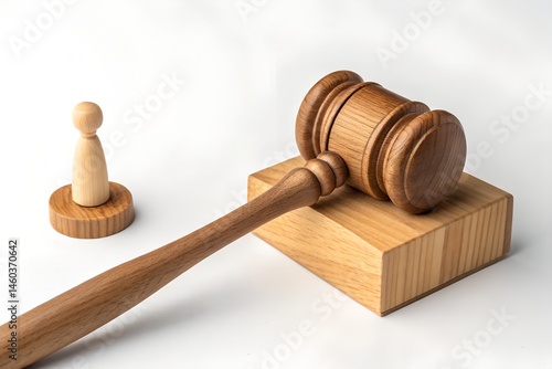 Wooden Gavel and Figurine: A close-up shot of a wooden gavel resting on a block, with a small wooden figurine standing nearby, symbolizing justice and judgment.