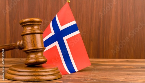 Wooden gavel and Norwegian flag on a brown wooden surface