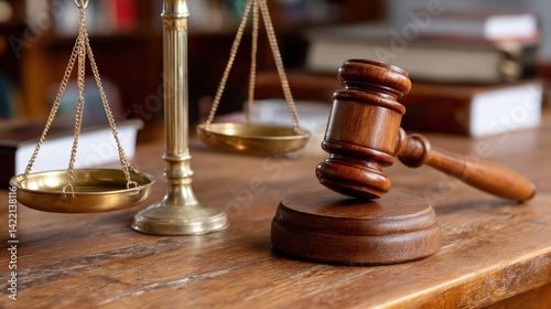 Wooden Gavel and Scales of Justice on Desk in Law Office Symbolizing Legal System and Fairness