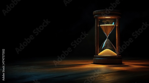 Wooden hourglass with flowing golden sand illuminated on a dark wooden surface creating a dramatic and contemplative atmosphere