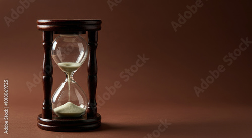 Wooden hourglass with sand falling between bulbs, symbolizing passage of time