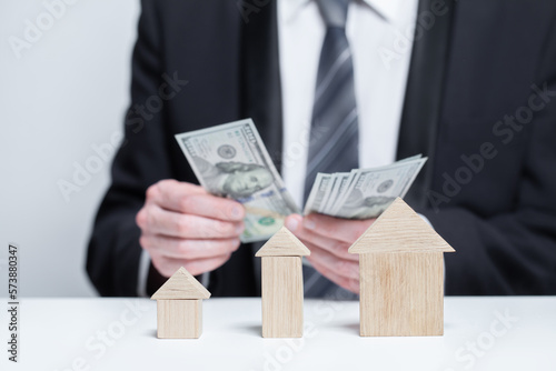 Wooden house models and us money dollars in businessman hands, byuing property, security, insurance concept